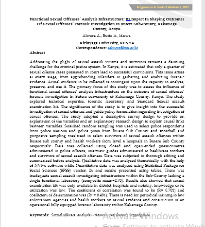 Addressing the plight of sexual assault victims and survivors remains a daunting challenge for the criminal justice system. In Kenya, it is estimated that only a quarter of sexual offense cases presented in court lead to successful convictions. This issue arises at every stage, from apprehending offenders to gathering and analyzing forensic evidence. Actual evidence to be collected is contingent upon the capacity to analyse, preserve, and use it. The primary focus of this study was to assess the influence of functional sexual offenses’ analysis infrastructure on the outcome of sexual offenses’ forensic investigation in Butere sub-county of Kakamega County, Kenya. The study explored technical expertise, forensic laboratory and Standard Sexual assault examination kit. The significance of the study is to give insight into the successful investigation of sexual offenses and guide policy formulation regarding investigation of sexual offenses. The study adopted a descriptive survey design to provide an explanation of the variables and an explanatory research design to explain causal links between variables. Stratified random sampling was used to select police respondents from police stations and police posts from Butere Sub County and snowball and purposive sampling was used to select survivors of sexual assault offences within Butere sub county and health workers from level 4 hospitals in Butere Sub County respectively. Data was collected using closed and open-ended questionnaires administered to police officers, interview guides administered to healthcare workers and survivors of sexual assault offenses. Data was subjected to thorough editing and summarized before analysis. Qualitative data was analysed thematically with the help of NVivo software while Quantitative data was analysed using Statistical Package for Social Sciences (SPSS) version 24 and results presented using tables. There was inadequate sexual assault investigating infrastructure within the Sub-County lacking a single functional laboratory (composite mean=2.70). Results also showed that sexual examination kit was only available in district hospitals and notably, knowledge of its utilization was low. The coefficient of correlation was found to be (R= 0.701) and coefficient of determination was (R2 = 0.491). There is need for periodical training to law enforcement agencies and health workers on sexual evidence and construction of an operational fully equipped forensic laboratory within Kakamega County.