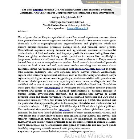Use of pesticides in Kenya's agricultural sector has raised significant concerns about their potential role in increasing cancer incidences. Pesticides often contain carcinogenic chemicals, such as organophosphates, organochlorines, and glyphosate, which can disrupt cellular hormonal processes, damage DNA, and promote tumor growth. Occupational exposure among farmers and agricultural workers, environmental contamination of food and water, and improper pesticide are exacerbating these risks. There are global evidences linking certain pesticides to cancers like non-Hodgkin lymphoma, leukemia, and breast cancer. However, direct evidences in Kenya remains limited due to a lack of comprehensive studies. Local research has identified pesticide residues in food, water, and soil, with some studies revealing concentrations above acceptable limits. Organochlorine pesticides have for instance been detected in breast milk samples, indicating long-term exposure among Kenyan women. Additionally, regions with intensive agricultural activities, such as the Rift Valley and Mount Kenya regions, report higher cancer cases, suggesting a possible correlation with pesticide use. However, challenges such as underreporting of cancer cases, misdiagnosis, and the multifactorial nature of cancer complicate efforts to establish a direct link. To address these gaps, this study was instituted to investigate the relationship between pesticide exposure and cancer in Kenya. It included biomonitoring of pesticide residues in human tissues, environmental sampling, and epidemiological surveys to assess exposure levels and cancer prevalence. The results showed glyphosate and DDT with a correlation value of r = 0.75, Chi square (χ²) of 4.8125 and a p < 0.028. This showed that the pesticides often appeared together in the samples. Phthalates and molluscicides had correlation value (r = -0.40), χ² value of 12.2203 and p < 0.002 which is highly significant. This indicated that molluscicides are used in places where phthalates were less common. Studies have linked phthalate exposure to breast cancer, testicular cancer, and liver cancer due to their ability to mimic estrogen and disrupt normal cell growth. The research recommends, strengthening of regulatory frameworks, promotion of safer alternatives, and raising public awareness about the risks of pesticide misuse. Notably, Kenya can mitigate the potential health risks posed by pesticides and safeguard public health by integrating scientific research with policy interventions.