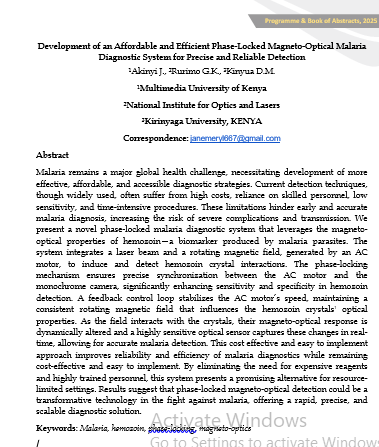 Malaria remains a major global health challenge, necessitating development of more effective, affordable, and accessible diagnostic strategies. Current detection techniques, though widely used, often suffer from high costs, reliance on skilled personnel, low sensitivity, and time-intensive procedures. These limitations hinder early and accurate malaria diagnosis, increasing the risk of severe complications and transmission. We present a novel phase-locked malaria diagnostic system that leverages the magneto-optical properties of hemozoin—a biomarker produced by malaria parasites. The system integrates a laser beam and a rotating magnetic field, generated by an AC motor, to induce and detect hemozoin crystal interactions. The phase-locking mechanism ensures precise synchronization between the AC motor and the monochrome camera, significantly enhancing sensitivity and specificity in hemozoin detection. A feedback control loop stabilizes the AC motor’s speed, maintaining a consistent rotating magnetic field that influences the hemozoin crystals' optical properties. As the field interacts with the crystals, their magneto-optical response is dynamically altered and a highly sensitive optical sensor captures these changes in real-time, allowing for accurate malaria detection. This cost effective and easy to implement approach improves reliability and efficiency of malaria diagnostics while remaining cost-effective and easy to implement. By eliminating the need for expensive reagents and highly trained personnel, this system presents a promising alternative for resource-limited settings. Results suggest that phase-locked magneto-optical detection could be a transformative technology in the fight against malaria, offering a rapid, precise, and scalable diagnostic solution.