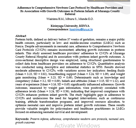 Preterm birth, defined as delivery before 37 weeks of gestation, remains a major public health concern, particularly in low- and middle-income countries (LMICs) such as Kenya. Despite advancements in neonatal care, adherence to Comprehensive Newborn Care Protocols (CNCPs) remains inconsistent, affecting growth outcomes in preterm infants. This study assessed healthcare providers’ adherence to CNCPs at Muranga County Referral Hospital and its association with preterm infant growth outcomes. A cross-sectional descriptive design was employed, using structured questionnaires to collect data from healthcare providers on adherence to CNCPs. Quantitative analysis was conducted using descriptive and inferential statistics in SPSS. Results showed moderate adherence to CNCPs, with variations across key indicators: feeding fluids (Mean = 3.23, SD = 0.82), breastfeeding support (Mean = 3.24, SD = 1.09), and weight gain monitoring (Mean = 3.23, SD = 0.69). Determinants such as knowledge and competency (Mean = 3.2, SD = 0.89), beliefs and attitudes (Mean = 3.15, SD = 1.12), and years of experience (Mean = 3.16, SD = 0.65) significantly influenced adherence. Growth outcomes, measured by weight gain information, were positively correlated with adherence levels (Mean = 3.24, SD = 0.56), indicating that improved compliance with CNCPs enhances preterm infant growth. The study highlights gaps in adherence to CNCPs and underscores the need for targeted interventions, such as continuous training, attitude transformation programs, and improved resource allocation, to optimize neonatal care and improve preterm infant growth outcomes. These results provide valuable insights for policymakers and healthcare practitioners in LMICs focused on enhancing neonatal survival and development.