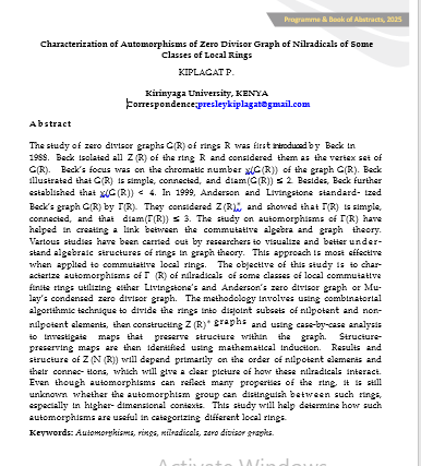 1988. Beck isolated all Z (R) of the ring R and considered them as the vertex set of G(R). Beck’s focus was on the chromatic number χ(G(R)) of the graph G(R). Beck illustrated that G(R) is simple, connected, and diam(G(R)) ≤ 2. Besides, Beck further established that χ(G(R)) < 4. In 1999, Anderson and Livingstone standard- ized Beck’s graph G(R) by Γ(R). They considered Z (R)∗ and showed that Γ(R) is simple, connected, and that diam(Γ(R)) ≤ 3. The study on automorphisms of Γ(R) have helped in creating a link between the commutative algebra and graph theory. Various studies have been carried out by researchers to visualize and better under- stand algebraic structures of rings in graph theory. This approach is most effective when applied to commutative local rings. The objective of this study is to char- acterize automorphisms of Γ (R) of nilradicals of some classes of local commutative finite rings utilizing either Livingstone’s and Anderson’s zero divisor graph or Mu- lay’s condensed zero divisor graph. The methodology involves using combinatorial algorithmic technique to divide the rings into disjoint subsets of nilpotent and non- nilpotent elements, then constructing Z (R)∗ graphs and using case-by-case analysis to investigate maps that preserve structure within the graph. Structure-preserving maps are then identified using mathematical induction. Results and structure of Z (N (R)) will depend primarily on the order of nilpotent elements and their connec- tions, which will give a clear picture of how these nilradicals interact. Even though automorphisms can reflect many properties of the ring, it is still unknown whether the automorphism group can distinguish between such rings, especially in higher- dimensional contexts. This study will help determine how such automorphisms are useful in categorizing different local rings.